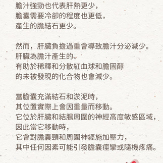 膽汁可以分解預防膽固醇結石,強效的膽汁代表肝熱情況較輕微,因此膽囊不需要用力地進行冷卻作用。